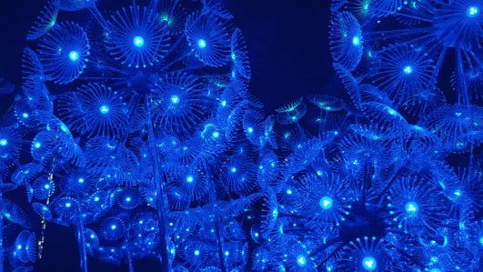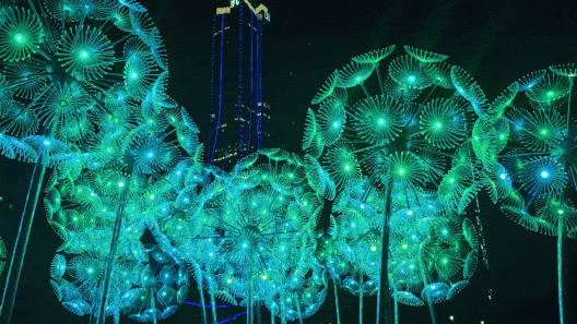 橫琴生態(tài)澤園的創(chuàng)意燈飾以含苞待放的喇叭花為主體造型,花朵使用充氣物料制成,內部藏有感應器。