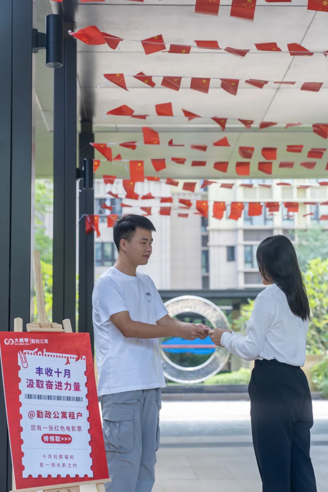 此外,大橫琴泛旅游公司也在旗下運(yùn)營(yíng)的多個(gè)公寓項(xiàng)目推出國(guó)慶特色主題活動(dòng),陪伴假期留駐的住戶們度過(guò)一個(gè)喜慶、歡樂(lè)的國(guó)慶佳節(jié)。國(guó)慶黃金周期間,勤政公寓開展了“豐收十月 汲取奮進(jìn)力量”活動(dòng),通過(guò)播放免費(fèi)電影豐富住戶生活,傳播奮進(jìn)力量;斗門大橫琴5.0產(chǎn)業(yè)新空間倒班宿舍也開展了 “青年共話中國(guó)紅”國(guó)慶主題抽獎(jiǎng)活動(dòng),設(shè)置留言祝福墻,以青春之言,表白祖國(guó)。