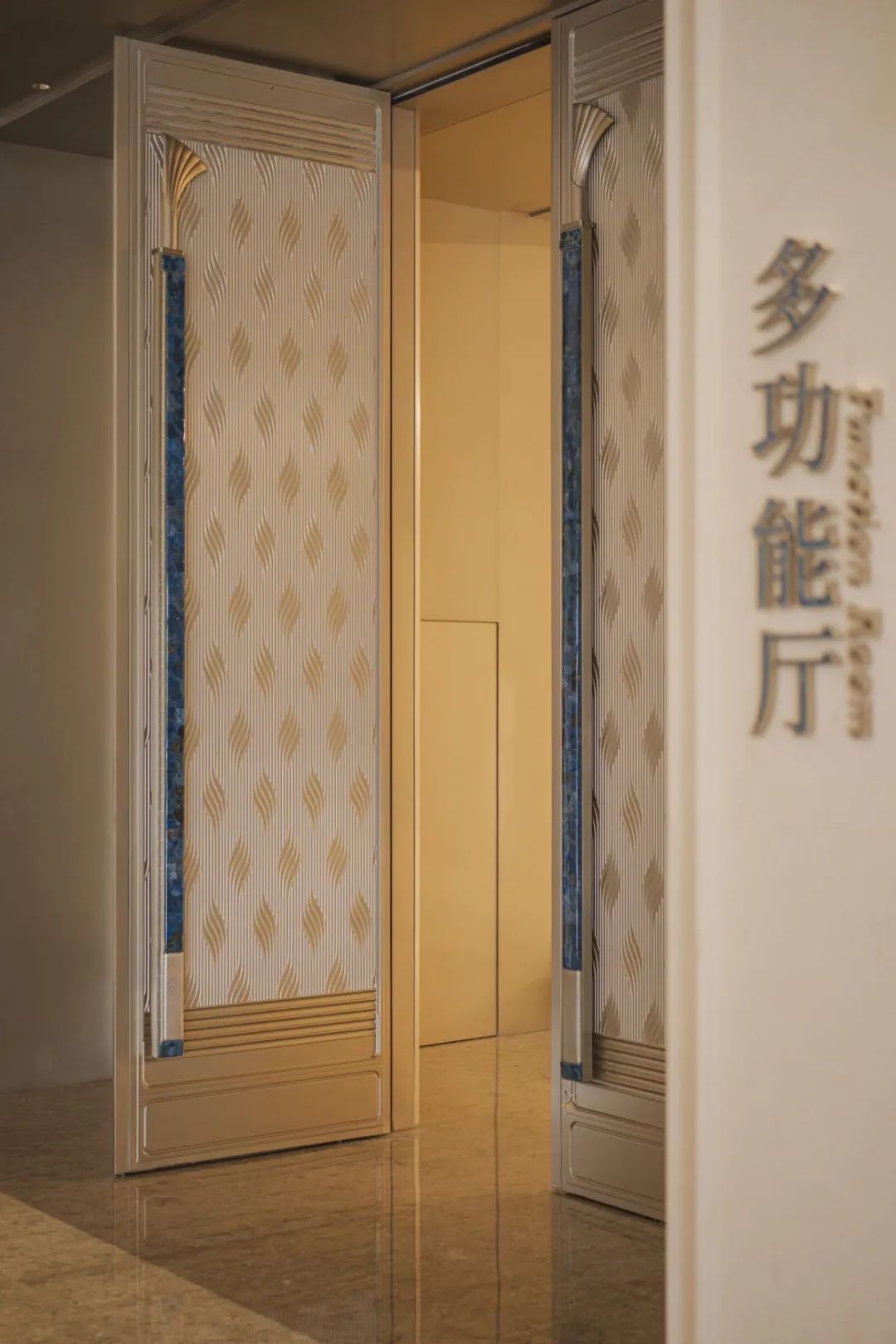 會議中心前廳頂面采用25朵花代表澳門回歸祖國25周年,造型中提取木棉花、蓮花寫意形體作為裝飾元素,圖案相互交錯(cuò),寓意“一國兩制”方針下粵澳共商、共建、共管、共享的新模式。